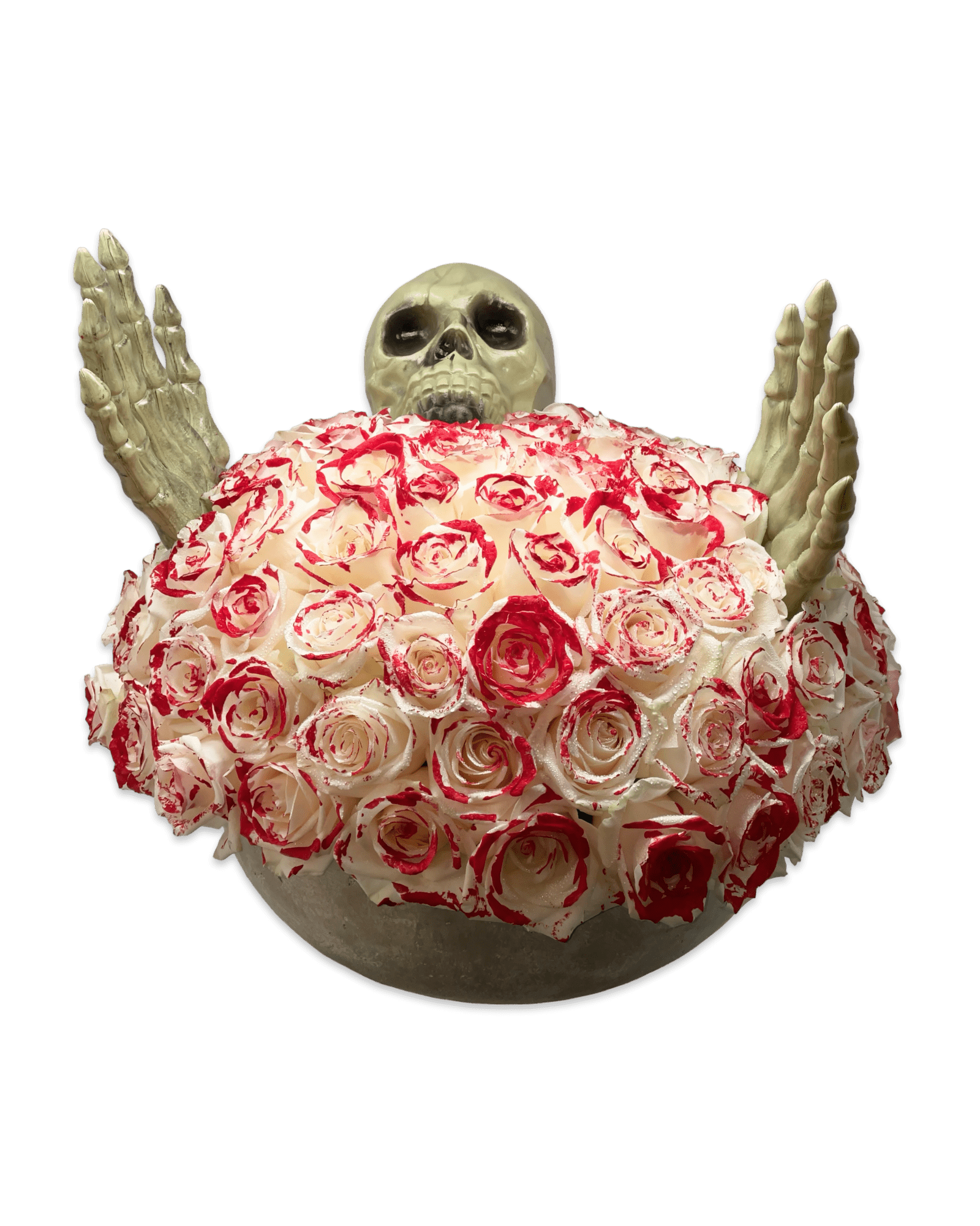 Dexter is the ultimate Halloween statement piece—bold, eerie, and unforgettable. Featuring pure white roses eerily splattered with crimson accents, this hauntingly beautiful arrangement emerges from our concrete vase, complete with a chilling skull and skeletal hands reaching from within. Perfect for those who love a touch of the macabre, this striking design sets the perfect spooky tone for the season.