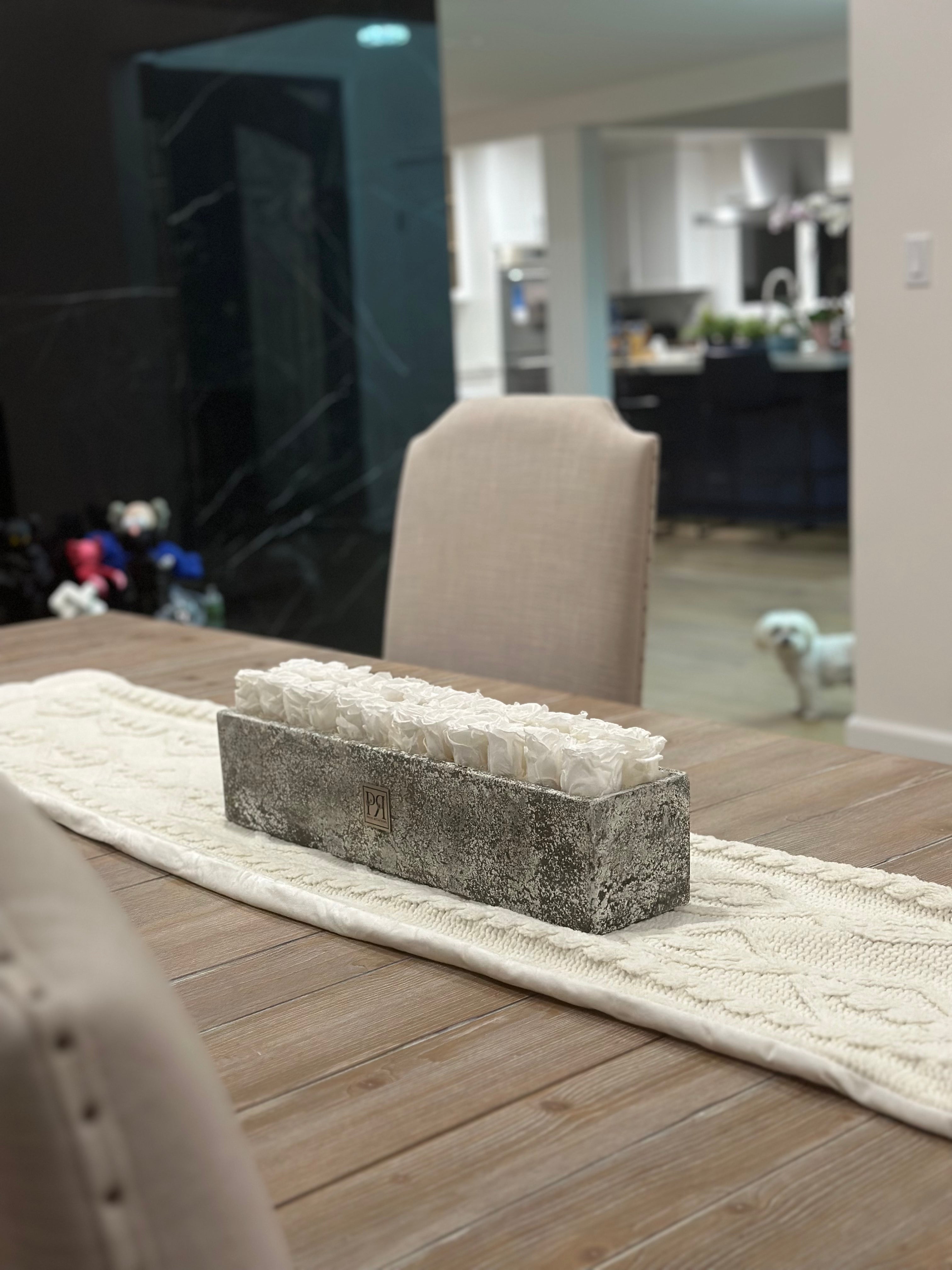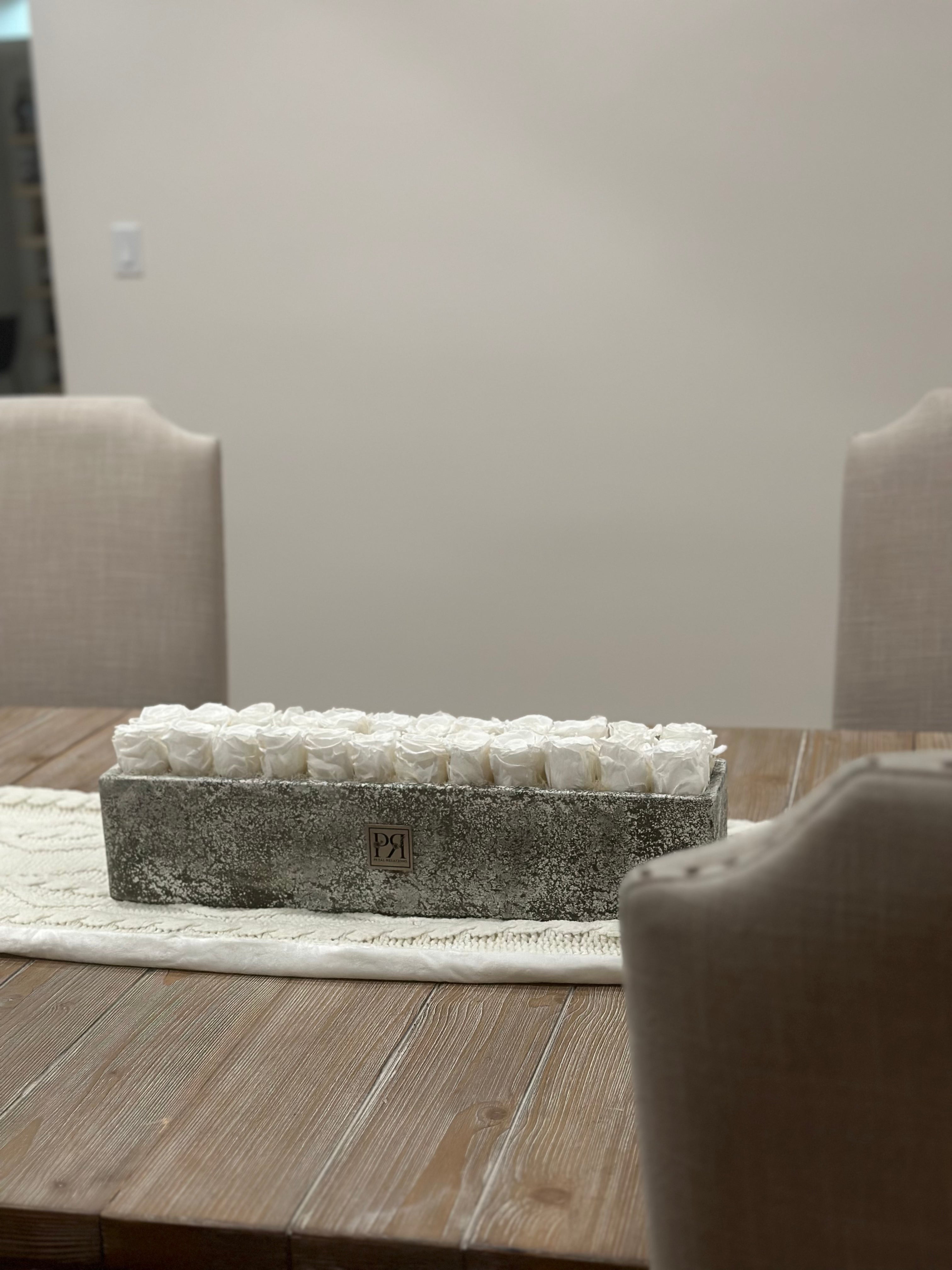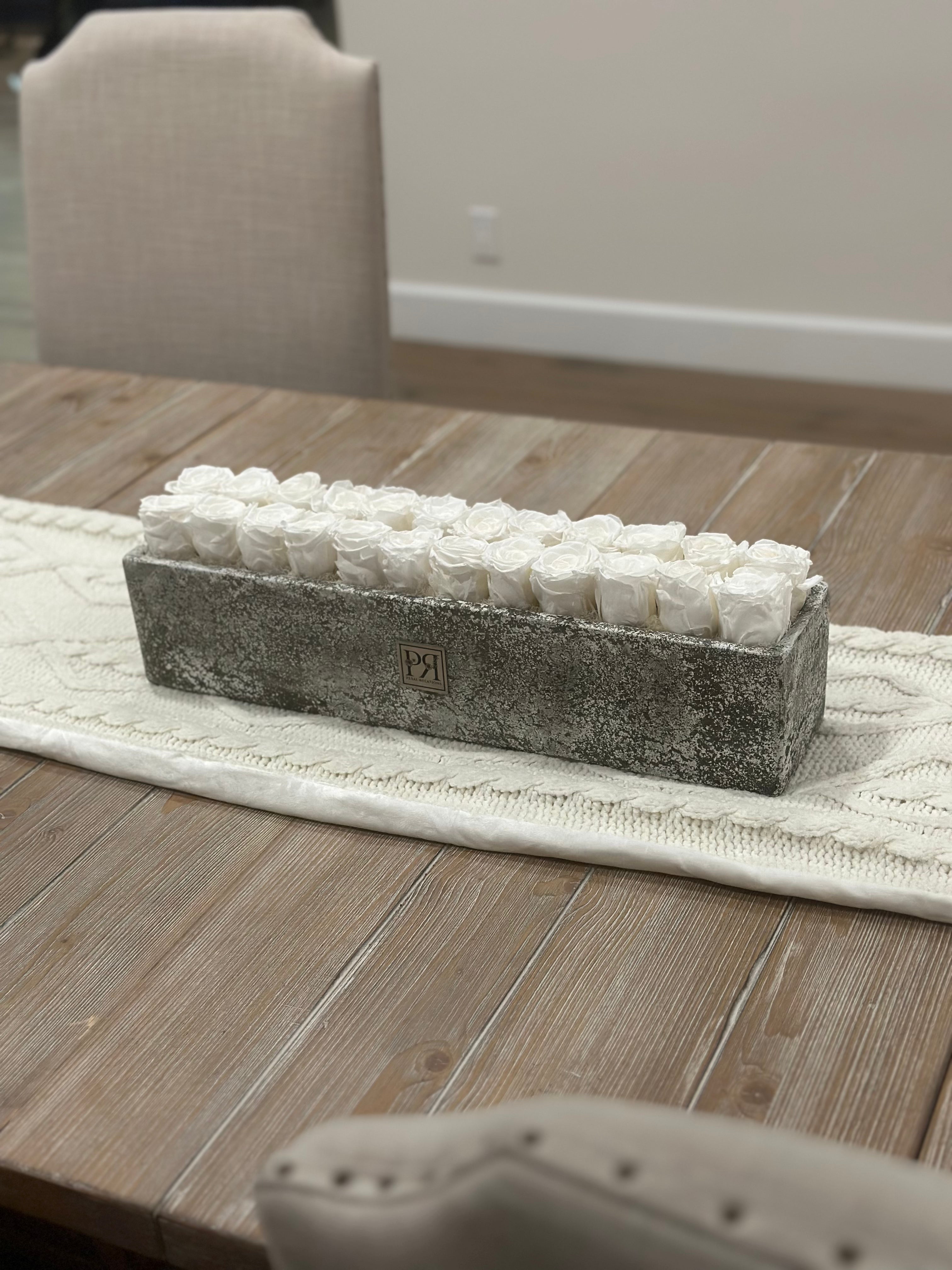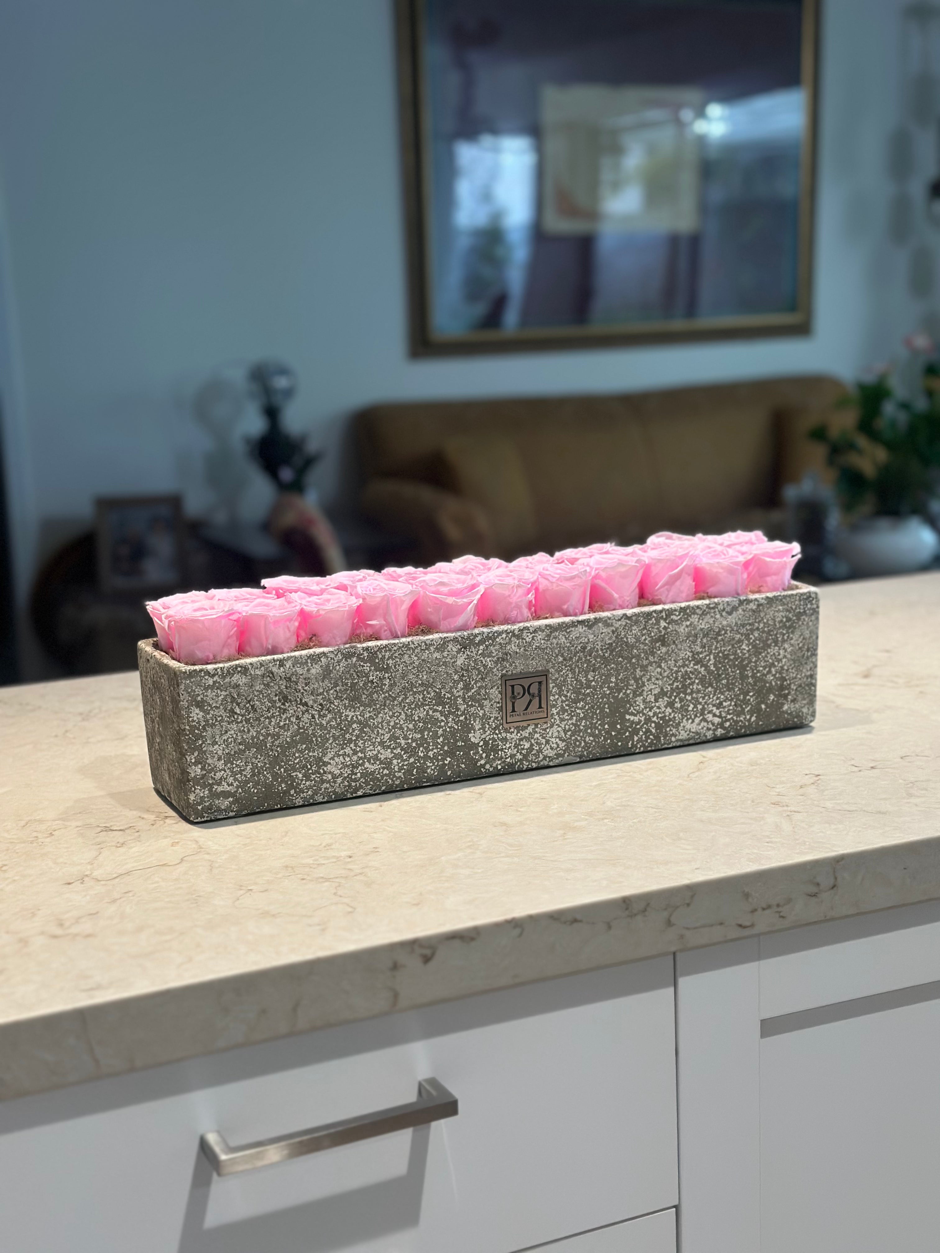 Forever Jumbo Rectangle from our Preserved Collection is the largest and most striking arrangement in our collection, designed to make an unforgettable statement. Featuring a breathtaking display of preserved roses in a sleek concrete base, this piece is built to last 1+ years with no maintenance required. Its grand size makes it the perfect centerpiece for a dining table, a luxurious accent above a mantle, or a showstopping addition to an entryway or office. A timeless expression of beauty and elegance that enhances any space.
