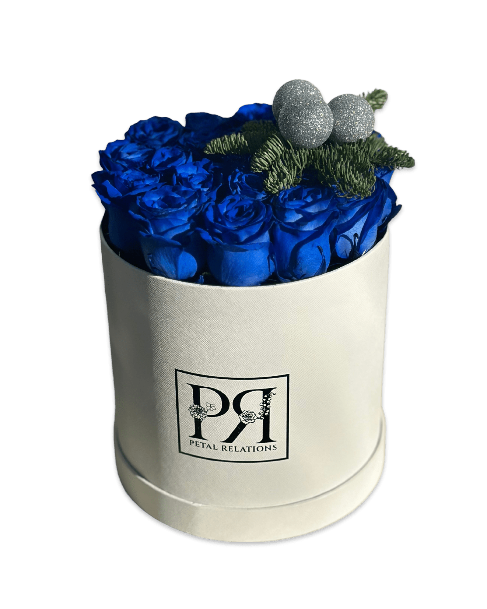 Jingle Bells is a unique and festive arrangement that brings a winter wonderland charm to the holiday season. Featuring an elegant display of deep blue roses arranged flat in our signature PR box, this design is accented with touches of Christmas greens and ornaments for a magical holiday feel. Perfect for gifting or decorating, Jingle Bells is a stunning way to celebrate the season with a modern and sophisticated twist.