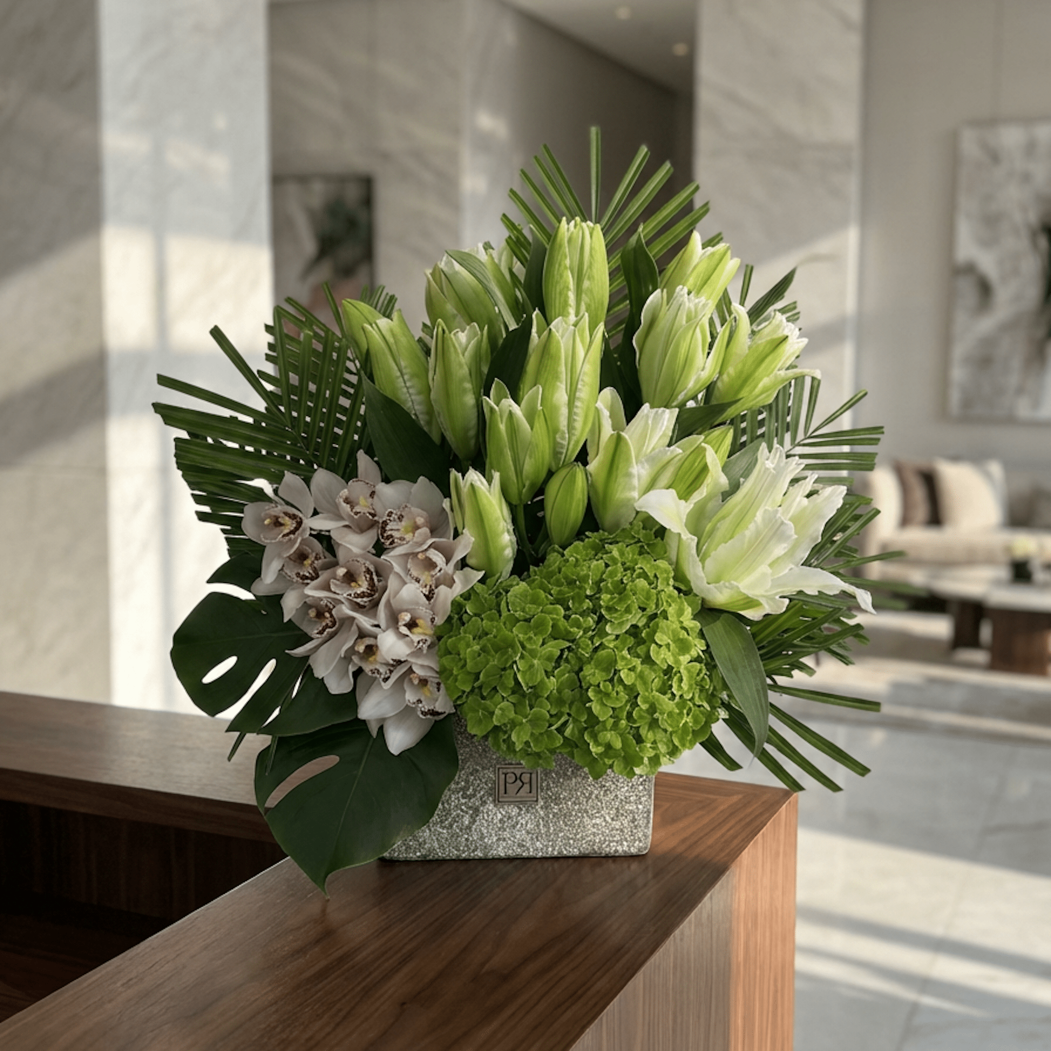 Lilly is a breathtaking arrangement that embodies elegance and sophistication. Featuring pristine white rose lilies, exotic cymbidium orchids, and lush green hydrangeas, this design is beautifully arranged in our sleek concrete vase. The fresh green tones and luxurious blooms create a stunning, modern look that makes Lilly a standout choice for any occasion. Whether as a thoughtful gift or a statement piece, this arrangement brings beauty and grace wherever it goes.