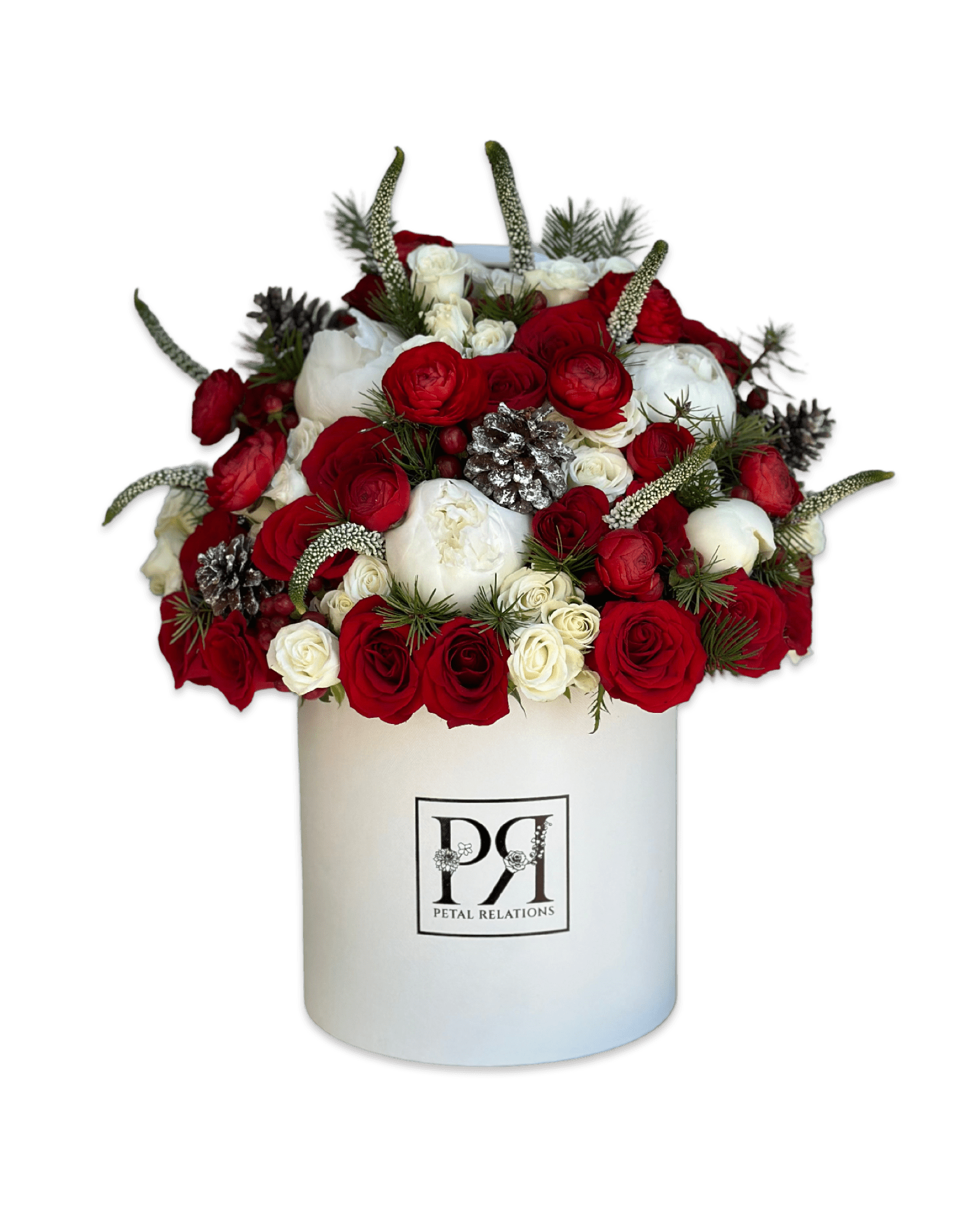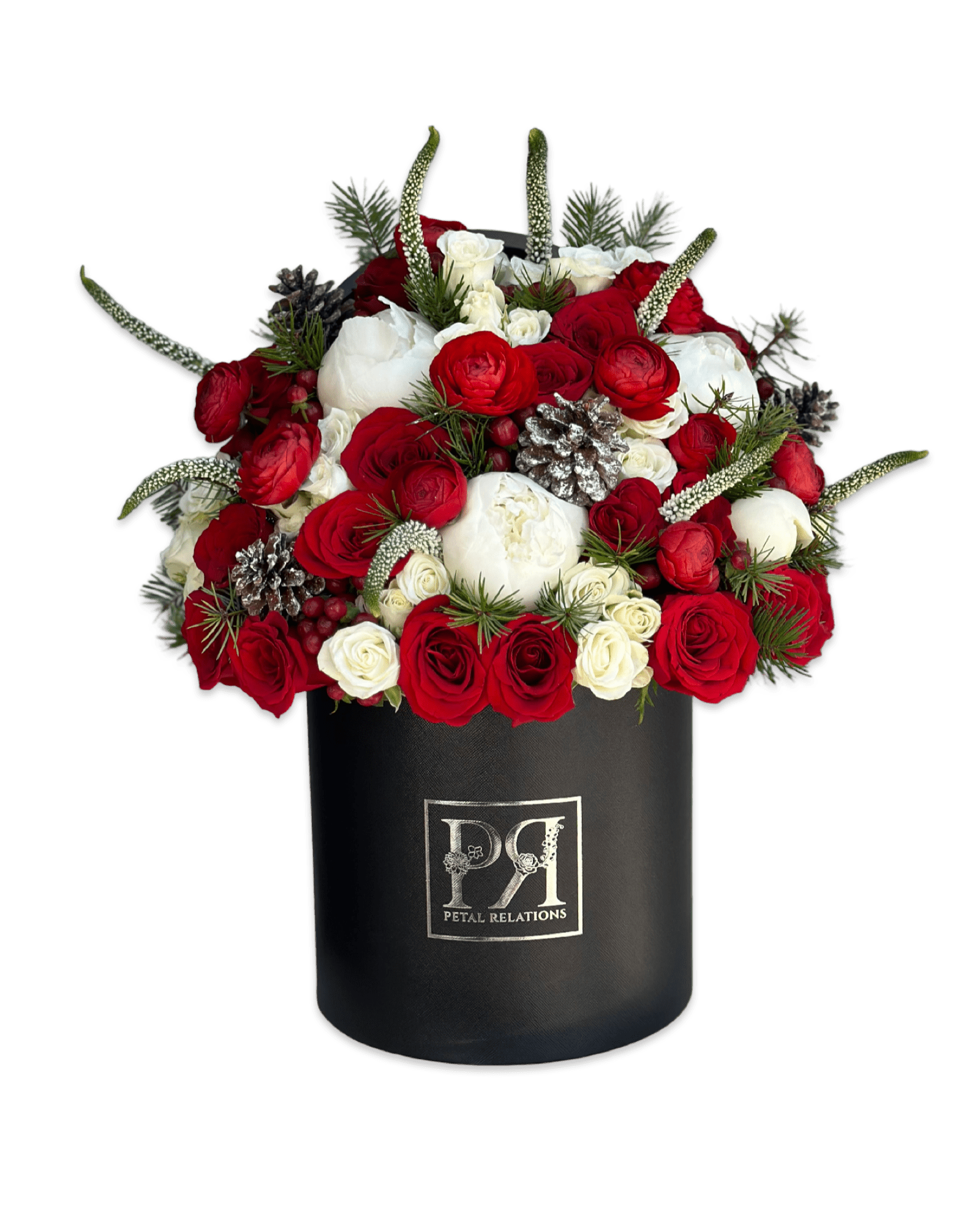 Santa Tell Me is a festive, elegant holiday arrangement that brings all the magic of the season into one stunning design. Styled in our signature PR box, this piece features a mix of red roses, fluffy white peonies, seasonal Christmas greens, pinecones, and other winter-inspired blooms. With its rich red, crisp white, and fresh green tones, this arrangement feels classic yet luxe—perfect for gifting, decorating, or adding a festive touch to any holiday celebration. Santa Tell Me is holiday cheer in floral form.