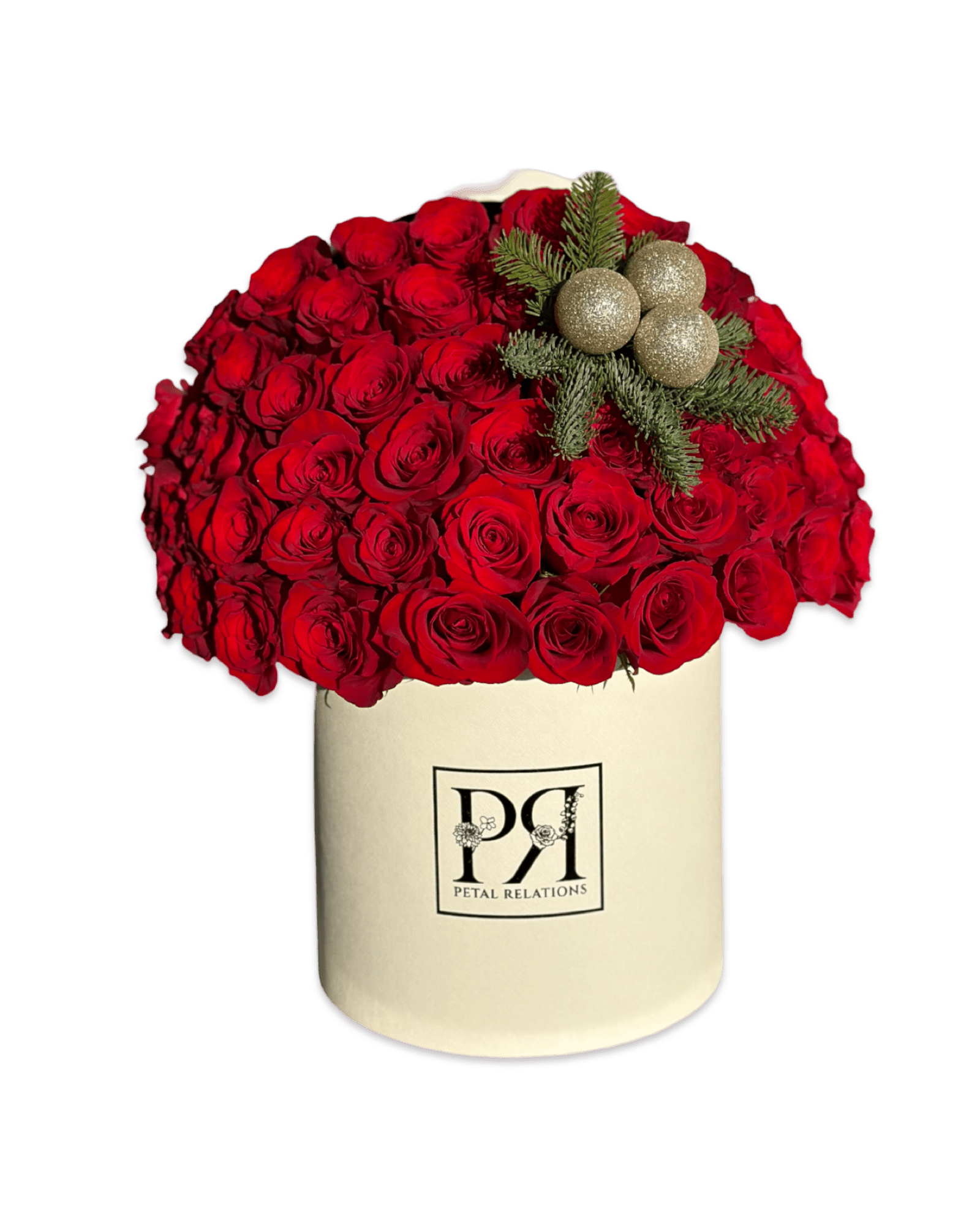 Sleighs is a bold and festive arrangement designed to capture the spirit of the season. Featuring a lush dome of rich red roses, accented with holiday greens and glittering ornaments, this piece is styled in our signature PR box for a polished and luxurious finish. Whether it’s for a gift, a centerpiece, or just to bring holiday cheer into your space, Sleighs is the perfect blend of classic beauty and Christmas magic.